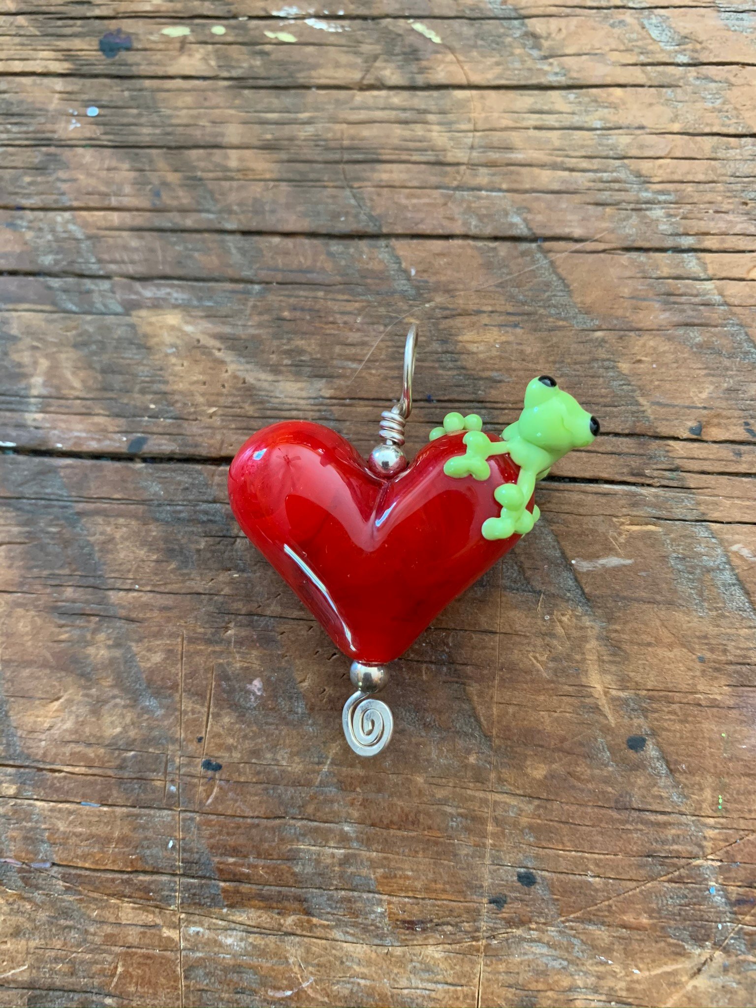 Red heart with green frog lamp worked glass heart with sterling silver findings that can be worn on most any necklace.