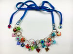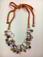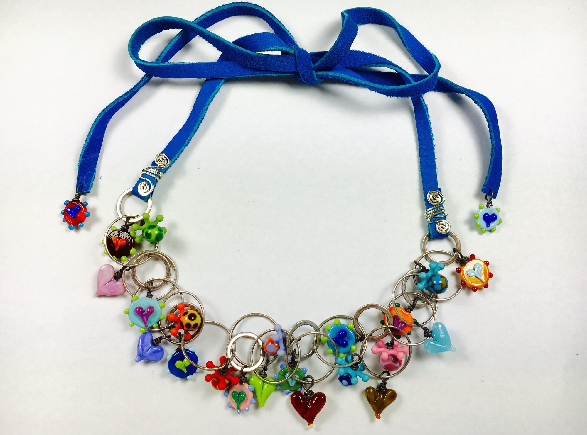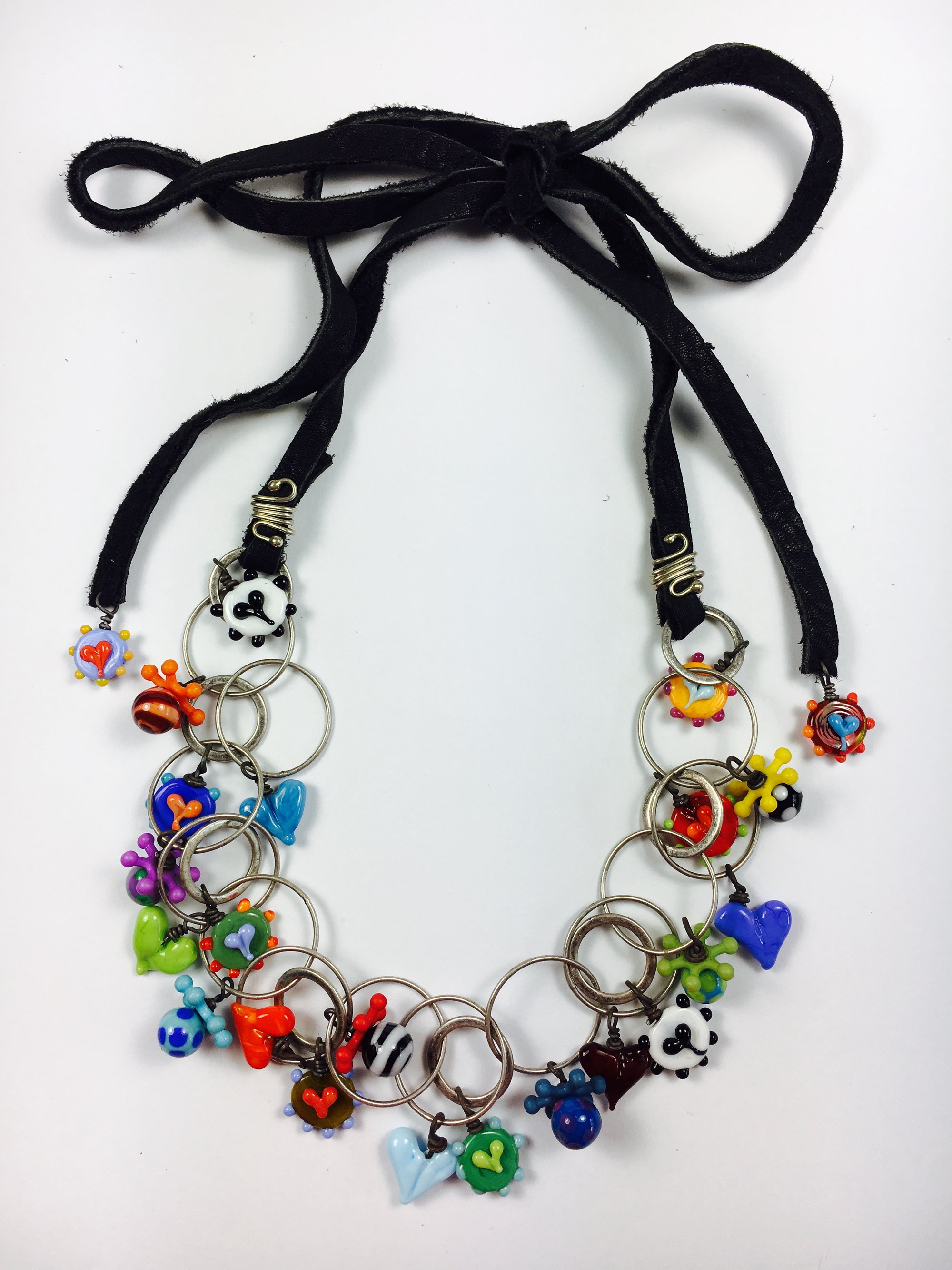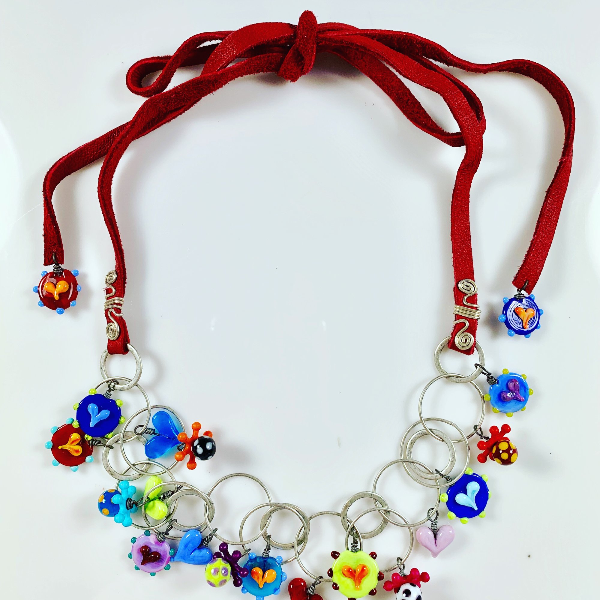 Fun, easy to wear necklace! Whimsy can be tied at any desirable length. Made with my hand made lamp worked glass, doe skin leather and metal chain.